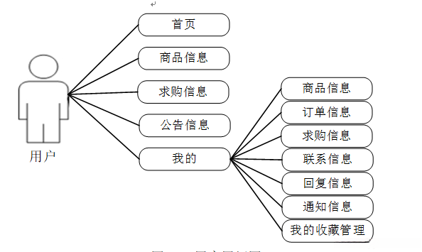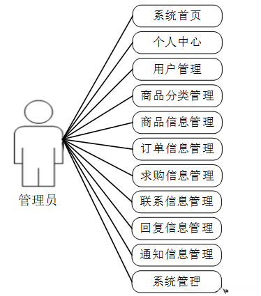 本论文中实现的跳蚤市场将以用户核心的日常信息维护工作为主,主要涵盖了系统首页、个人中心、用户管理、商品分类管理、商品信息管理、订单信息管理、求购信息管理、联系信息管理、回复信息管理、通知信息管理、系统管理等功能,采用该跳蚤市场将满足管理员和用户日常管理工作的基本需求。本系统与管理员和用户操作的全过程相契合,从管理员和用户登录开始录入系统,然后记录跳蚤市场信息,从而让管理员和用户对系统的管理都能够清晰规范,相应信息的检索和维护简单高效,进而提高用户整体工作的效率。系统用户用例如下: