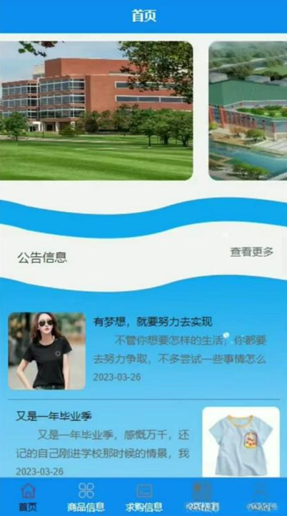 首页是用户注册登录后进入的第一个界面,用户可通过跳蚤市场首页的最下面的那一行导航栏进入到相应的网页进行操作;首页界面如图: