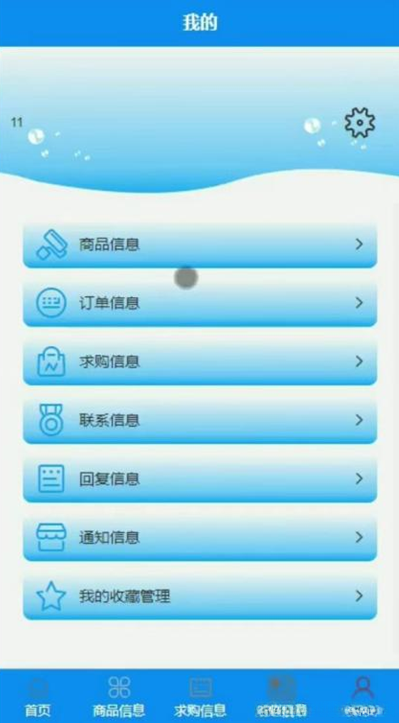 点击“我的”进入用户功能页面,在用户功能页面可以对商品信息、订单信息、求购信息、联系信息、回复信息、通知信息、我的收藏管理等进行详细操作。用户功能界面如图: