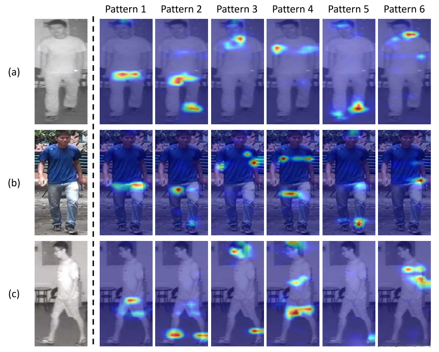 图说明了两个身份的三个行人图像的个人注意模式,其中第k列是Mk ⊙ F的可视化结果。我们可以观察到,PAM生成的每个模式图都集中在某种不同于其他模式的模式上,而没有模态和姿势的影响。可视化显示了细微差别在此任务中的重要性,并且PAM在其上运行良好。