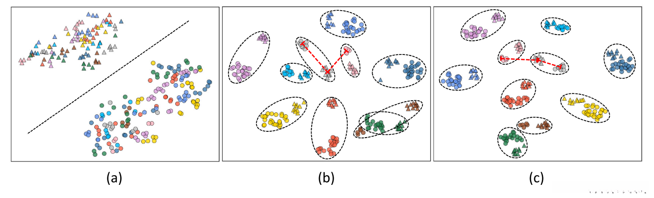圆形和三角形表示从可见光和红外光中提取的特征。(a)由在图像集上预先训练的基线提取的特征; (b)由基线提取的特征; (c)由 mpanet 提取的特征。结果表明,mpanet 能较好地缓解语气差异,提高区分能力.