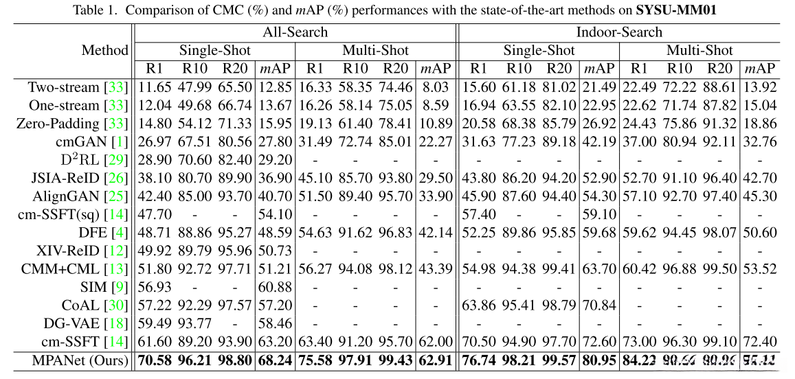 所提出的MPANet框架包括两个用于缓解模态差异的模态缓解模块 (MAM),一个用于发现不同模式中的细微差别的模式对齐模块 (PAM),以及一种相互均值学习方式来训练具有中心聚类损失和交叉熵损失的模型以进行身份识别。具体来说,MAM使用实例归一化来缓解模态差异,同时保持对扩展的区分性。通过轻量级生成器,图案对齐模块生成一组图案图,这些图案图参加不同的图案以发现细微差别。该模块的输出是通过将模式特征和全局特征连接在一起获得的。为了以无监督的方式发现细微差别,设计了一个区域分离约束,以确保每个模式映射都属于不同的模式。然后提出了中心簇丢失,以减少相同身份的某些模式特征之间的距离,同时增加不同身份的特征中心之间的距离。我们进一步应用两个特定于模态的分类器来从每个模态中学习特征的身份,并预测相同特征的分类结果。此外,通过以相互平均学习的方式减少由不同模态特定分类器生成的同一图像的预测之间的分布差异,可以缓解模态差异。最后,对这两个模块进行级联和端到端的联合优化。通过上述工作,MPANet提取的特征是模态不变的,可以表示不同模式中的细微差别。