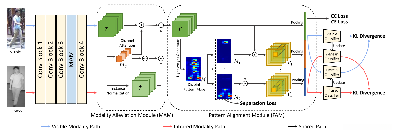 模式对齐模块 (PAM) 生成模式图,以发现不同模式中的细微差别。提出了分离损失,以确保模式图集中在不同的模式上。然后,提出的中心聚类损失指示每个模式图集中于某个模式,并通过交叉熵损失共同指导身份学习。为了指导网络缓解模态差异,以相互均值学习的方式将两个特定于模态的分类器与两个相应的均值分类器一起应用。