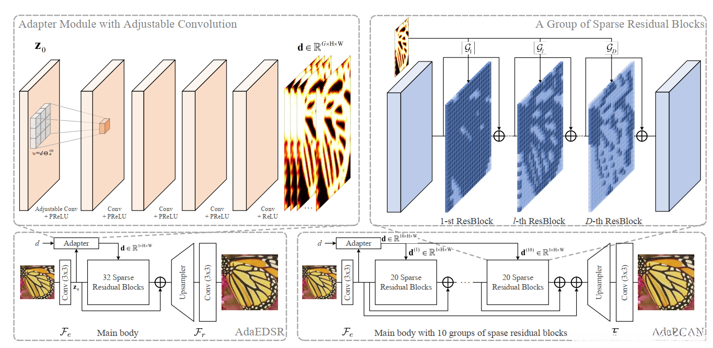 本节介绍了我们的AdaDSR单图像超分辨率模型.. 首先,我们为主干配备了一个网络深度图,以方便空间变异推断。 然后,引入稀疏卷积,通过省略不必要的计算来加快推理。此外,还部署了一个轻量级适配器模块来预测网络深度图。 最后,总体网络结构(见图)。