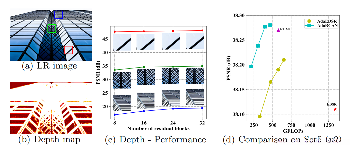 如图所示。 1.超分辨率的困难是空间上的不同。例如,它不需要经过公式2中所有的残差块来重建平滑区域, 对于纹理丰富细致的区域,为了实现高质量的重建,通常需要更多的残差块。因此,我们引入了一个2D网络深度图