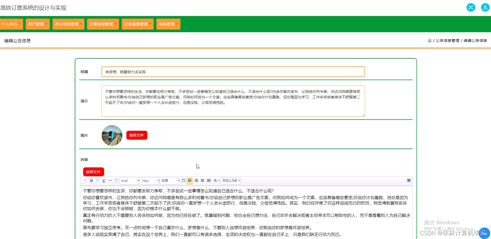 随着高铁技术迅速发展, 人们 increasingly prefer to travel by high-speed rail. However, conventional ticket booking methods involve lengthy waiting lines and unreliable information. Consequently, developing an efficient highrail ticket booking system becomes crucial. This system can offer convenient online booking services, including flexible seat selection and payment options. Additionally, it can provide real-time updates on train schedules and available seats. By utilizing this system, passengers can more easily plan their journeys and enhance their travel experience.