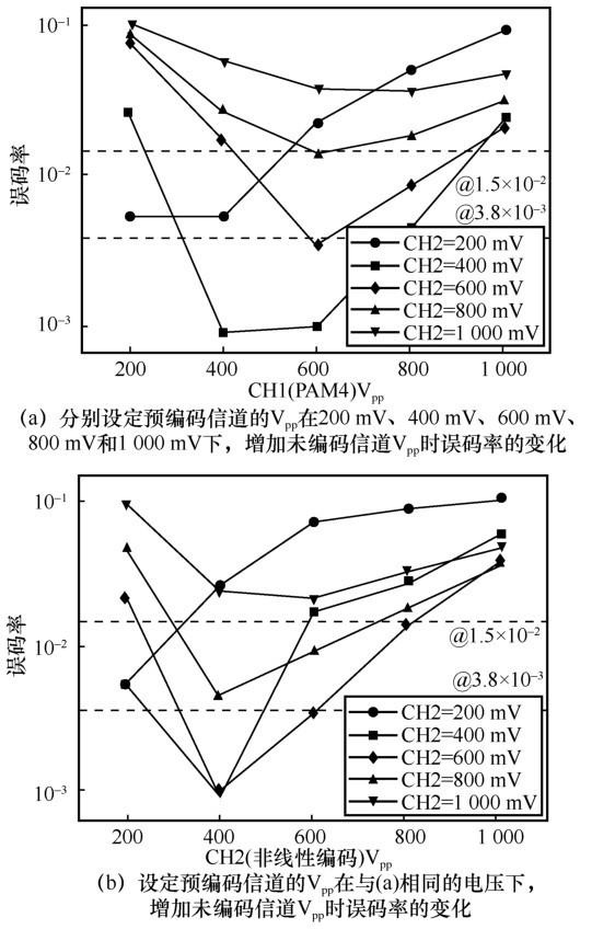 首先,将两路平均误码率的热力图沿着两路信道的方向分别转换为两条线图,分别表示固定一路信道峰峰值电压而改变另一路的系统误码率。信道Vpp对系统误码率的影响如图6所示,同一条线上的误码率最小值反映出:如果降低此时的信号功率,则会导致噪声影响过于显著,而继续提升信号功率则会使得非线性效应更加明显,尽管增加的功率带来的失真,却使得信号质量反而下降。观察图6(a)可以发现,随着非线性编码信道信号功率的提升,线图的最小值点逐渐向右(高功率)移动。在编码信道峰峰值电压为200 mV时,对应的最小值出现在200~400 mV区间。当编码信道峰峰值电压为1 000 mV时,对应的最小值出现在800 mV附近。而图6(b)也反映出类似的情况,只是相较于图6(a),这一变化幅度并不显著。如果将最小误码率左侧的区间称为“有益区间”(即升高信号功率会降低误码率),则未编码信道的有益区间显著高于编码信道。这一现象主要归因于非线性编码信道的电平数量。在非线性程度相近的前提下,更多的电平数会导致非线性带来的码间干扰更加严重,而这种干扰难以被线性后均衡器完全消除。因此,在较低的发射功率下,升高信号功率带来的信噪比增益已经被非线性带来的失真所抵消。如果需要提高非线性编码信道的动态范围,则需要增加编码信道的前向纠错冗余。通过对比两图可以看出,编码信道在采用20%冗余的硬判决前向纠错(对应误码率门限为1.5×10-2)时,该信道的Vpp动态范围可以达到此前的约200%,同时能够容忍未编码信道更大的功率波动。这意味着,如果两路信道的条件都不理想,可以考虑配合使用非对称的冗余编码。相比于将两路信道的冗余都提升到20%,这种方案整体的编码冗余更少,通信速率也更高。