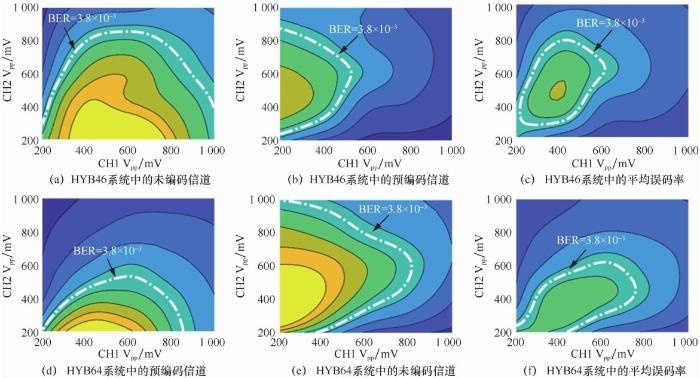 误码率随信道Vpp变化的热力图如 图 4 所示,其描述的是采用非对称编码的叠加调制系统各通道以及两通道的平均误码率。实验中等间距测量了从200~1 000 mV峰峰值电压下系统的误码率,采样间隔为 200 mV。并且对进行了三次方多项式插值,从而得到该热力图。为了排除信道中其他干扰因素的影响,实验中交换了未编码信道和预编码信道, HYB46 即第一路未编码而第二路编码的情形, HYB64则相反。 图 4 中白色虚线为7%前向纠错所对应的门限误码率。从 图 4 可以粗略看出使用非对称编码带来的影响:未使用非线性编码的通道( 图 4(a)、 图 4(e))在更大的电压范围(200~800 mV),可以保证信道的误码率维持在可用的范围内。然而,使用非线性编码的通道( 图 4(b)、 图 4(d))可用范围相比之下更为狭窄,最大可用的峰峰值电压仅为600 mV。