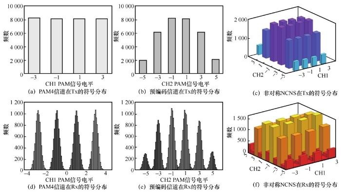 非对称编码的NCNS符号频数分布直方图如图3所示,CH1表示未编码,CH2表示编码。采用非对称编码后,两路信道发射的符号出现非对称分布。从发射端的频数分布直方图图3(a)和图3(b)可以看出,预编码后符号分布呈现不均匀性。大多数符号集中在中心的4个符号位置,而两端的符号出现频率较低。相比之下,未编码的信道中,符号在4个电平上均匀分布。图3(c)中,两个信道的符号按等间距排列,但由于实际发射时两信道使用相同的峰峰值电压,在六电平信号方向上,符号的排列应更加紧密。