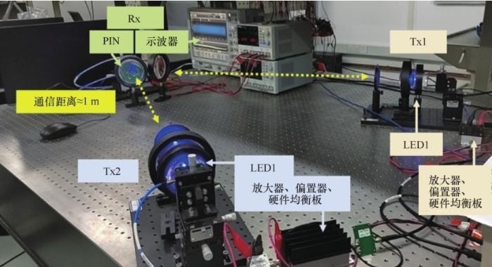 实验装置如图2所示,包括了两发一收的可见光通信系统,其发射机和接收机的系统组成及相对位置均得以呈现。系统由两组发射机和一组接收机构成。发射机部分采用LED光源,通过偏置电路和放大器驱动,能够输出任意波形信号。接收机部分则采用了PIN光电探测器,将输入信号转换为电压信号并发送至示波器,最终由示波器完成信号波形的显示和数据采集。该系统的工作频率主要集中在450 nm(蓝光波段),其最大通信数据传输速率为2.25 Gbit/s。接收机部分使用了滨松光子公司生产的S10784型P-I-N光电二极管,其工作波长范围为400~1000 nm,能够覆盖实验中发射机所使用的波段。信号生成部分则采用了泰克AWG520任意波形发生器,而偏置电路和放大器部分分别由Mini-circuits生产的ZFBT-4R2GWFT和ZHL-6A-S+器件提供。最后,接收信号的观测与分析则采用了安捷伦生产的MSO9254A型示波器。整个发射机与接收机之间的距离约为1.5米。