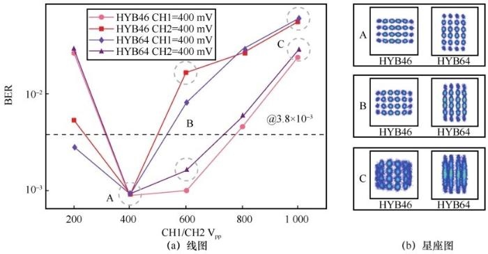 从微观层面分析,选取实验中具有代表性的数据,探讨两种编码策略对系统误码率的影响,如图5所示。图5(a)展示了在Vpp1设定为400mV的条件下,Vpp2通过两种非对称编码策略动态变化的情况。图5(b)则聚焦于图5(a)中用灰色虚线圈出的特定样本。图5(b)的子图标注了这三组样本在热力图上的对应位置。图5的线图能够较为准确地反映两种编码方式的误码率差异,而星座图则直观地展示了接收符号的分布情况,从而体现通信信号的质量。数据在热力图上的对应位置对应于某一信道峰峰值电压的垂直直线。首先,分析红、紫两种颜色所对应的HYB46系统(第一路未编码,第二路编码),可以观察到两路信道误码率的变化趋势。当固定编码信道的功率为400mV时,未编码信道发射功率分别为200mV和400mV,此时两路信号的误码率差异较小,如图中A点虚线圈所示。星座图显示,此时系统受噪声影响较大,因为星座点呈现的椭圆形较为规则。而在B点所圈出的区域,两路误码率差异显著增大,达到最大值。根据星座图的分析,可以判断此时信号已出现非线性现象。C点所圈出的区域显示,两路信道的误码率持续上升,但误码率的差异却逐渐缩小。同时,星座点出现扭曲现象,表明非线性问题日益严重。其次,分析红、紫两种颜色所对应的HYB64系统(第一路编码,第二路未编码),可以发现类似的变化趋势。但在Vpp1为400mV、Vpp2为600mV的条件下,HYB64系统编码信道与未编码信道的平均误码率均低于HYB46系统。这一发现表明,在两路信号功率确定的情况下,对编码设置的非对称交换可能会影响通信质量。基于此,接下来将进行非对称编码的干扰分析,以深入研究这一现象。