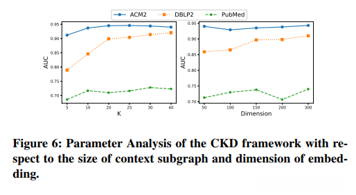 我们还通过调节维度范围25至125来考察嵌入维度对CKD任务的影响。如图6-(b)所示,在设置维度约为50时,CKD模型表现出稳定的性能,这与以往网络嵌入研究中常见的做法一致。