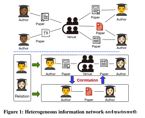 尽管有效果,但我们坚信这些方法尚不能充分生成令人满意的成果。每个元路径都承载着HIN的特定语义,尽管它们均源自同一对象的不同视角,但这种关联性源于它们反映了同一对象的不同维度。例如,两名共同撰写论文的研究人员(使用meta-path APA)往往具有相似的研究兴趣,并更倾向于将论文提交至同一地点(使用meta-path APVPA)。显然,这两种元路径之间存在密切关联,从其中一种元路径获得的知识将显著提升另一种元路径学习其嵌入的效果。 然而,现有方法论将每个元路径孤立处理,**** 在学习元路径嵌入过程中忽视了数据资源间的内在联系。尽管元路径嵌入最终将被整合[9,32,47],但中间环节的不足会导致最终表示的性能下降。