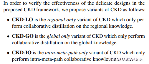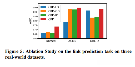 图5展示了对CKD框架变量在链接预测任务上的消融研究。结果显示:CKD的表现优于CKD- lo、CKD- go、CKD- io,这表明有必要通过协同蒸馏的方式对区域知识和全球知识进行提取。比较CKD-LO和CKD-GO的表现,我们可以发现不同HIN数据集在区域和全局知识上具有各自的独特特征。这进一步验证了在统一框架内提取区域和全球知识的有效性。综上所述,消融研究验证了CKD框架中所设计模块的有效性。