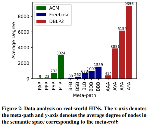 图2呈现了三个真实世界HINs的数据集分析结果。X轴代表数据集中选择的元路径,Y轴则代表元路径在同质信息网络中的平均节点度。通过分析不同元路径的同质信息网络,我们发现它们在同一个HIN中呈现出显著的密度差异。在ACM数据集中,Paper-TermPaper(PTP)与Paper-Author-Paper(PAP)的节点度差异达到了惊人的300倍。