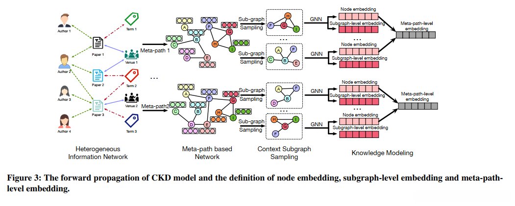 CKD方法主要由三个组成部分构成:语义上下文子图采样、异构知识建模和协作知识蒸馏。 一种基于元路径的节点嵌入方法可以通过整合所有元路径信息来提取全局模式。图3详细展示了我们CKD模型的正向传播过程,并对节点嵌入、子图级嵌入和元路径级嵌入的定义进行了说明。
