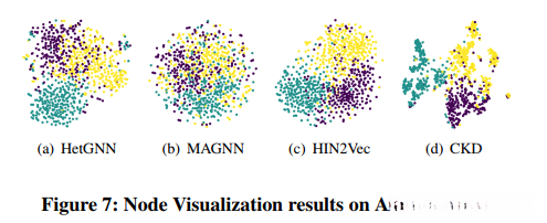 图7清晰地展示了实验结果。从图中可以看出,所提出的CKD框架的结构设计具有良好的可解释性,因为相同类别的节点(以颜色标记)之间的距离相对较近,而不同类别的节点之间具有显著的区分度。这些实验结果进一步验证了该方法在实验中展现出良好的分类性能。