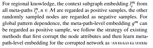 具体而言,区域知识指的是在每个语义空间中,将区域知识建模为围绕其的子图级别嵌入表示。全局知识则通过元路径级嵌入来表示,尽管区域知识展示了每个节点的局部连接模式,但它无法保持HIN在所有位置共享的全局连接模式。通过元路径级嵌入,我们可以更有效地捕捉和表示这些全局连接模式。