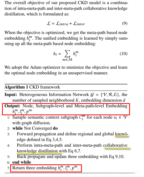 尽管这一问题具有重要意义,但同时需要在每个元路径的语义和不同元路径之间的相关性上保持一致,这是一项挑战,因为它们的本质是相互冲突的。首先,我们提出了一种新的协作知识蒸馏(Collaborative Knowledge Distillation, CKD)框架,以显式保存元路径之间的语义和相关性。该框架首先采用图扩散和上下文子图抽样策略来解决不同元路径的稀疏性问题。我们通过区域知识和全局知识两种不同的粒度对每个元路径中的知识进行建模。每个元路径中的知识被协作地提炼,以相互增强。在元路径内和元路径间使用互信息作为度量,指导学习的精馏,以更好地嵌入学习。