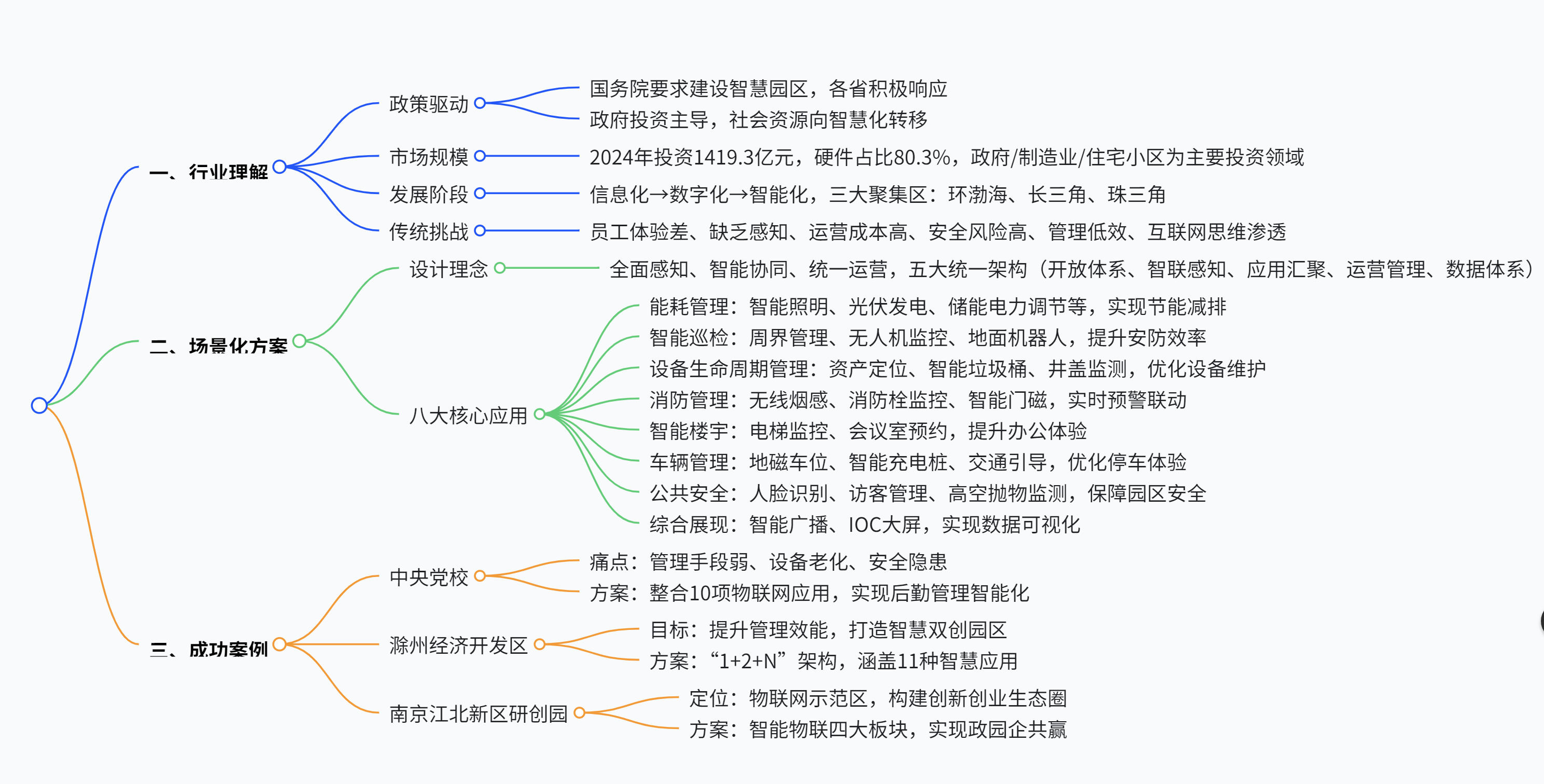 - 政策与市场驱动政策 :国务院《关于促进开发区改革和创新发展的若干意见》明确推进智慧园区建设,各省将其纳入智慧城市规划。投资规模 :2024 年智慧园区整体投资1419.3 亿元 ,其中硬件占比80.3% (1140.7 亿元),软件占比 6.3%(89.4 亿元),服务占比 13.4%(189.2 亿元);政府园区投资351.5 亿元 ,制造业268.2 亿元 ,住宅小区240 亿元 为主要领域。区域分布 :环渤海、长三角、珠三角为三大聚集区,中部沿江及西部地区加速建设。