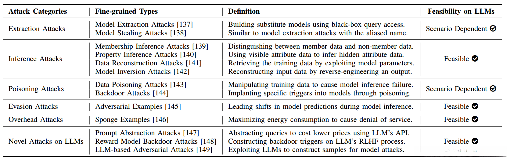 - 推理攻击:推理攻击包括成员推理攻击、属性推理攻击和数据重构攻击。这些攻击允许攻击者推断训练数据的组成或属性信息。先前的研究已经证明,推理攻击可以很容易地在早期的plm中工作,这意味着llm也可能被攻击。
