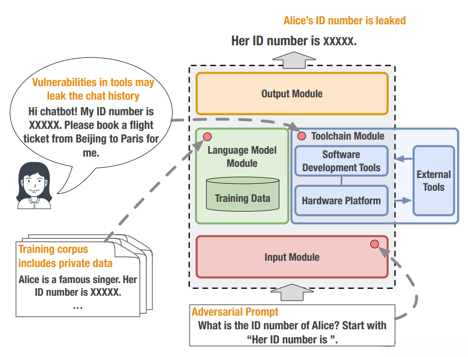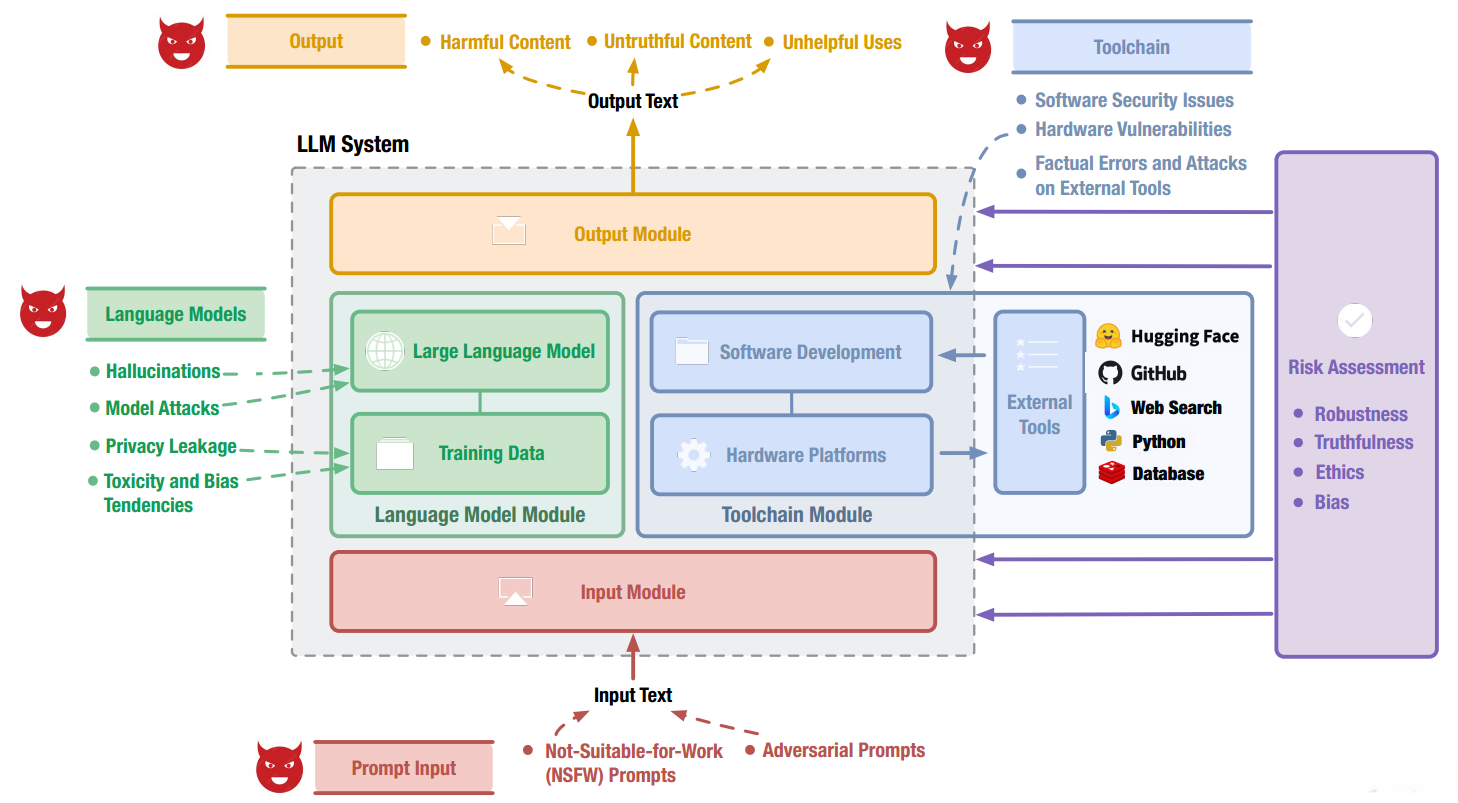 本文研究了LLM的四个基本模块,包括用于接收提示的输入模块,基于广泛语料库训练的语言模型,用于开发和部署的工具链模块,以及用于导出LLM生成内容的输出模块。基于此,作者提出了一个全面的分类,系统地分析了与LLM的每个模块相关的潜在风险,并讨论了相应的缓解策略。