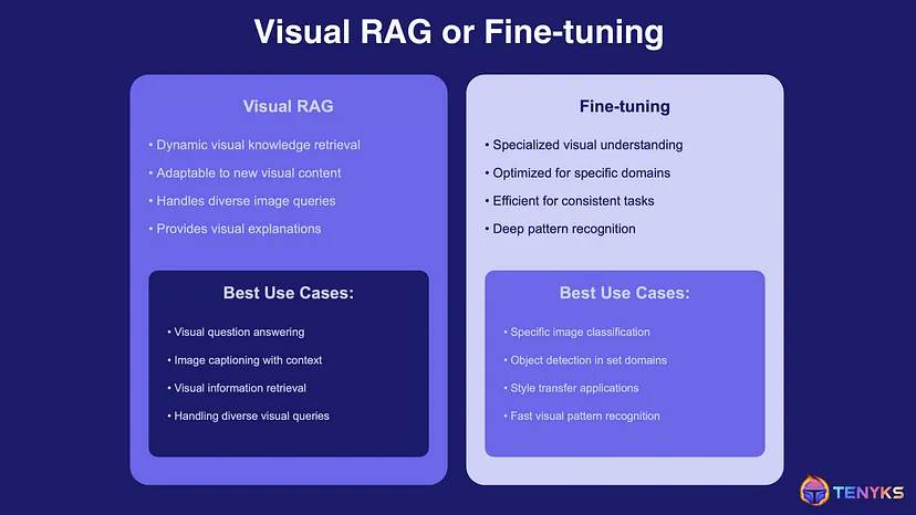 - 具有核心任务的不断发展的领域:例如,在医学成像领域,有标准的诊断程序(通过微调处理),但也有快速发展的研究和新的案例研究(由 Visual RAG 解决)。