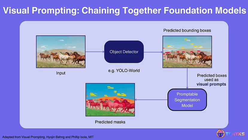 图 1. YOLO-World 输出(即边界框)用作 SegmentAnything 的输入(即视觉提示)