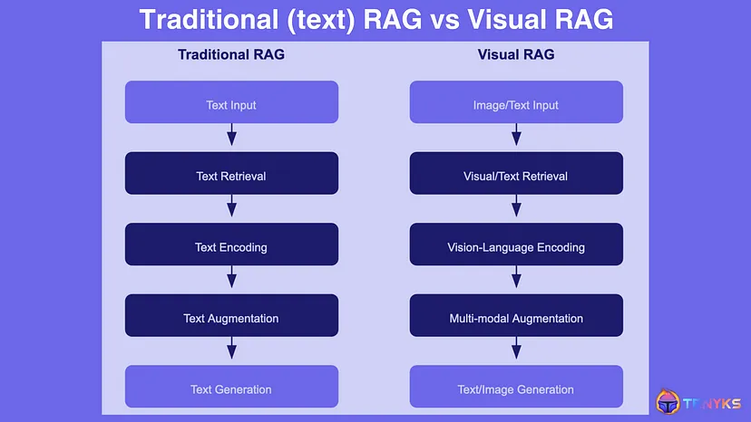 传统 RAG 处理文本输入并检索相关文本信息,而可视化 RAG 处理图像(有时还附带文本),并检索视觉数据或图像-文本对。