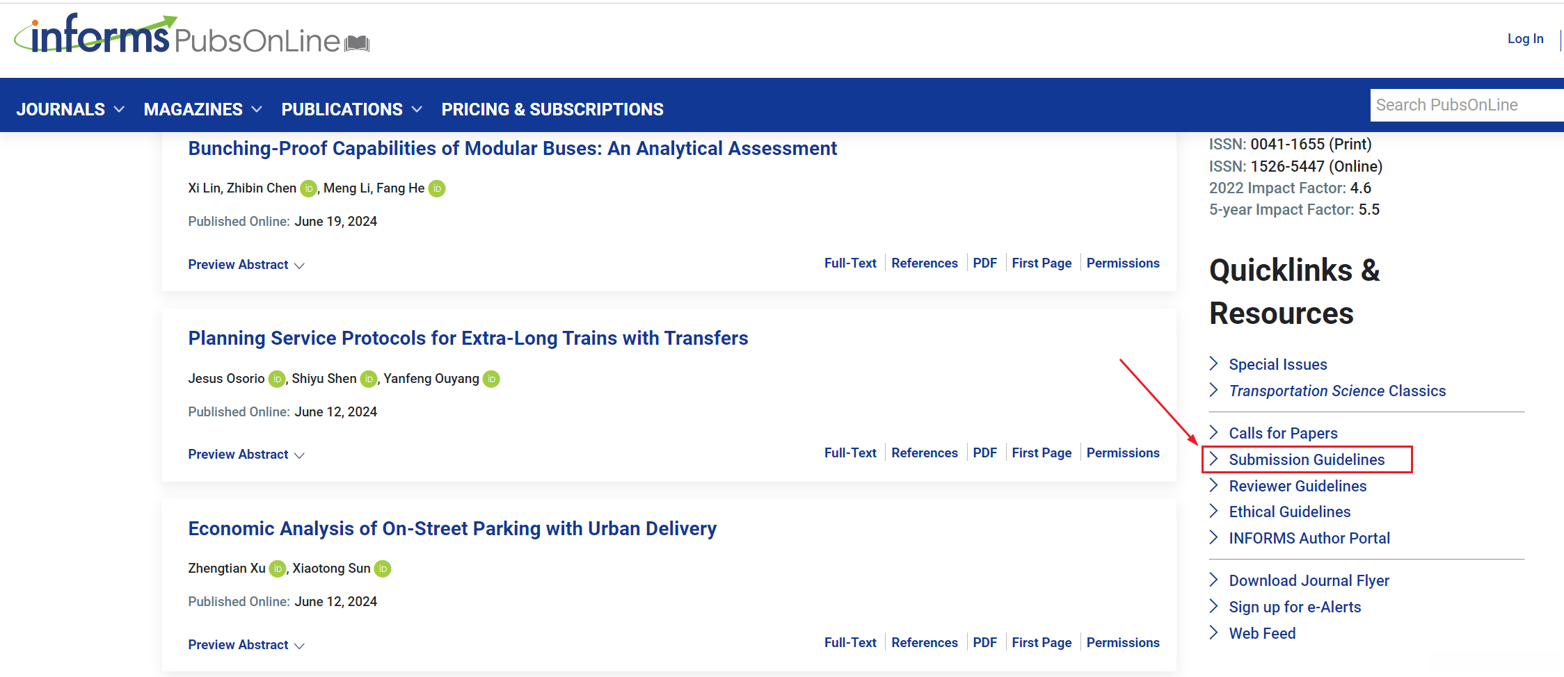 除了审阅 Transportation Science 的提交指南外,请您也审阅普遍适用的 INFORMS 提交指南。这些指导文档可通过以下链接获取:here.