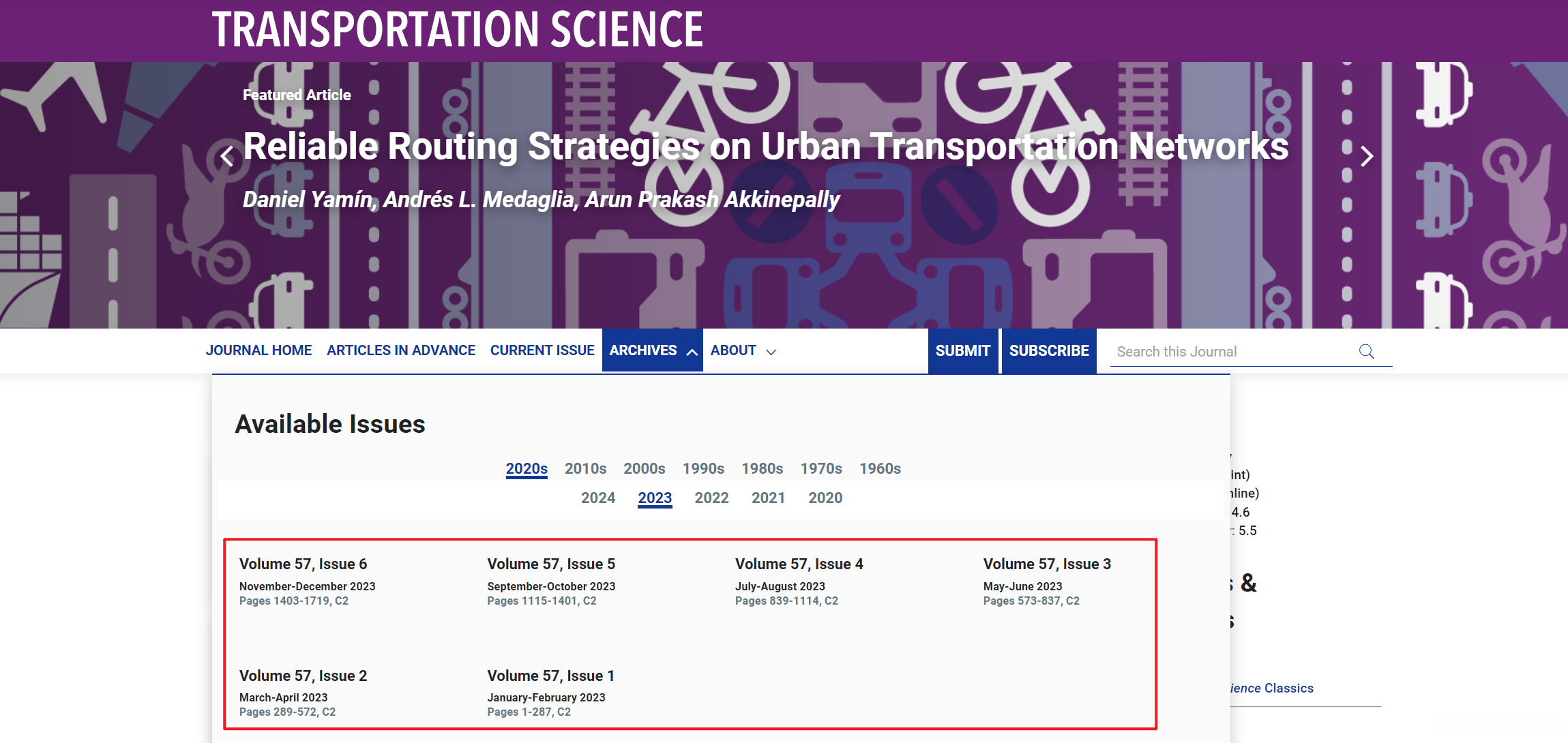 As an internationally renowned scientific journal dedicated to the field of transportation systems analysis across multiple disciplines,Transportation Science serves as a platform for publishing high-quality original research covering a wide range of topics related to all modes of transportation—both present and future; all levels of planning—strategic,tactical,and operational;and all types of impacts—economic,social,and environmental.The journal is primarily focused on advancing fundamental theories through observational studies.experimental investigations.mathematical modeling.innovative methodologies,and novel applications within the domains of transportation science.Transportation Science encompasses a broad spectrum of subjects including,but not limited to,the design and optimization of transportation systems,theories and models related to traffic flow,and their practical applications in traffic management.strategic,tactical,and operational strategies for transportation systems.economic aspects of transportation systems.analysis of traveler behavior.and the demand for efficient transportation services