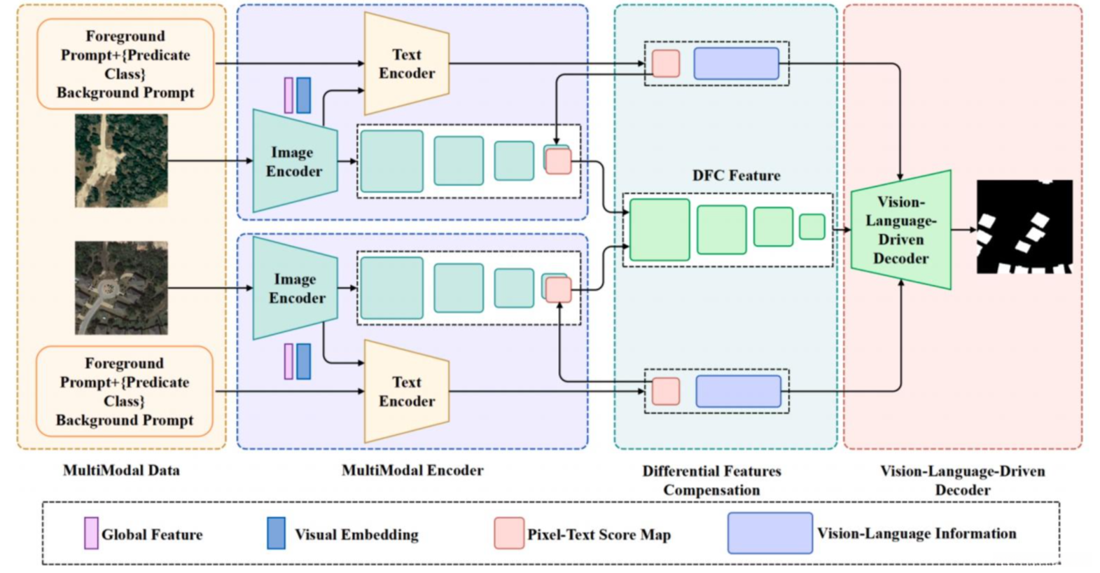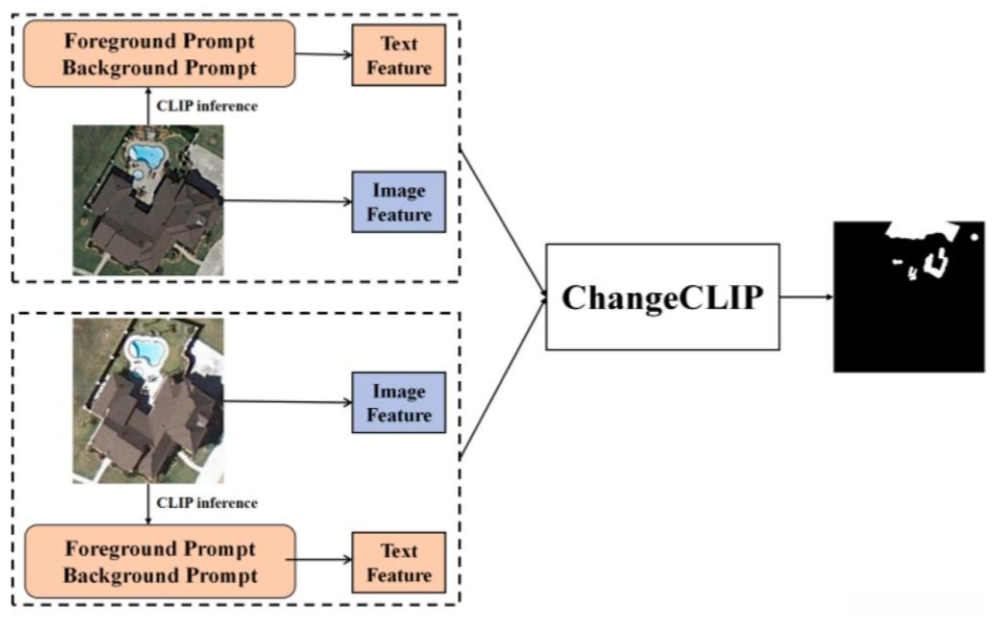 * 在第一个组件中,利用CLIP模型的无监督分类能力**生成遥感图像的文本提示** ,从而构建变化检测任务的多模态输入数据。