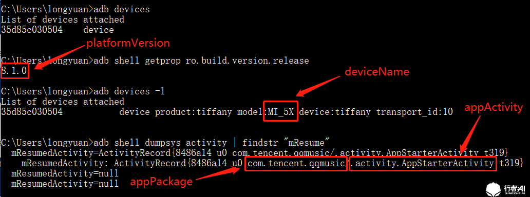 以上数据通过adb命令获取,获取appPackage与appActivity时需要将app启动 ,获取命令如下: