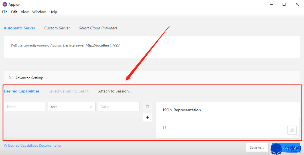 (1)点击Start Inspector Session对进行Desired Capabilities的配置,在JSON Representation中输入以下json数据点击保存进行快速的配置,也可以在左边一项一项的添加。platformName、platformVersion、deviceName、appPackage、appActivity这五个参数是必填项 。