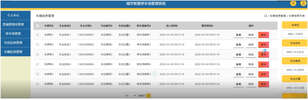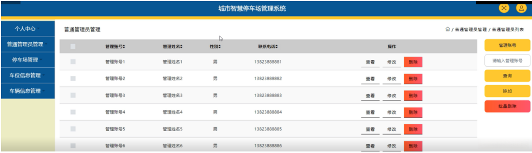 该部分内容包含了个人中心,普通管理员管理,停车场管理,车位信息管理,车辆信息管理等功能。管理员可对所有的信息进行增、删、改、查,能对用户信息进行管理,更新最近的城市智慧停车场管理系统。