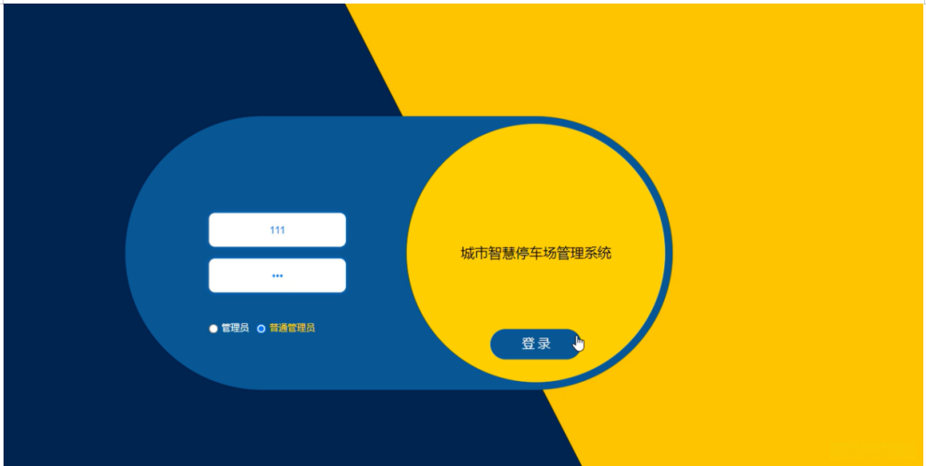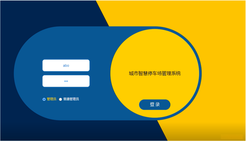该界面是城市智慧停车场管理员首页,界面设置要求界面简洁明了、操作简单、兼容性好。在考虑设计界面时,首先要考虑界面标准化设计,其次是完善界面设计,但不要因对界面的美化使界面的操作变得复杂,管理员可在此页面进行登录等操作,页面左侧导航条是各模块的入口。