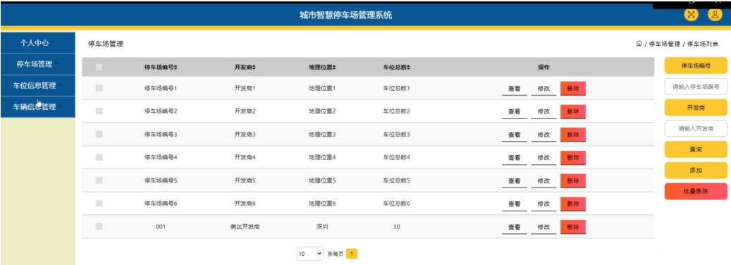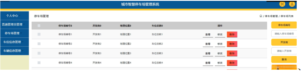 停车场管理,在停车场管理页面可以查看停车场编号,开发商,地理位置,车位总数等内容,并进行查看、修改和删除操作,如图5-4所示。
