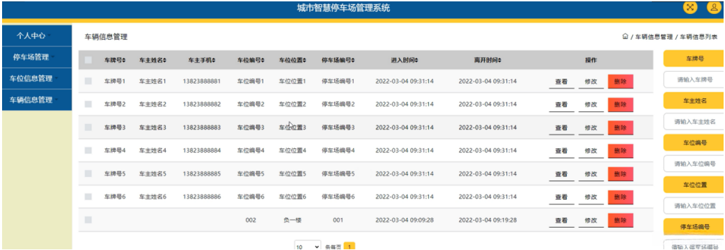 车辆信息管理管理,在车辆信息管理页面可以查看车牌号,车主姓名,车主手机,车位编号,车位位置,停车场编号,进入时间,离开时间等内容,并进行车辆登记、查看、修改和删除操作,如图5-6所示。