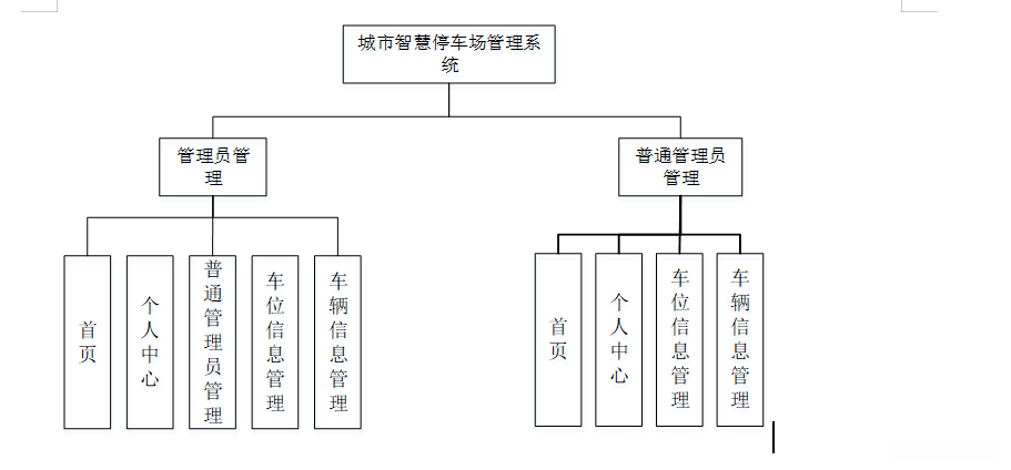 该部分内容包含了个人中心,停车场管理,车位信息管理,车辆信息管理等功能。为了方便更直观的理解,下图以图形形式给出关于整个网站的结构图。网站总体功能结构图3-1如图所示: