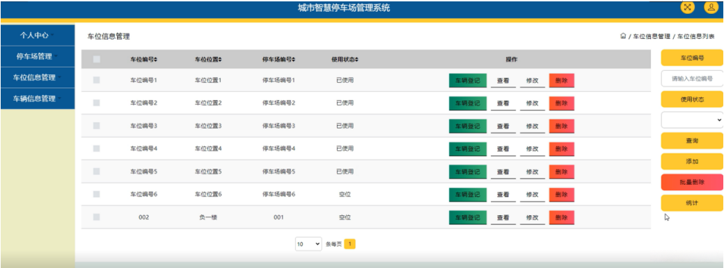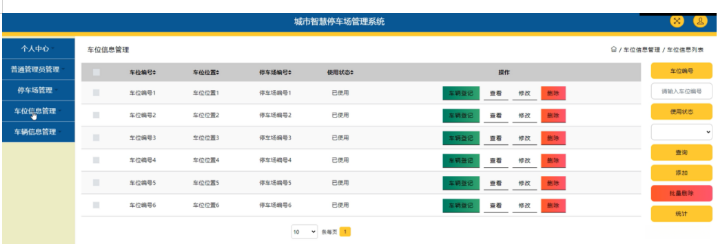 车位信息管理管理,在车位信息管理页面可以查看车位编号,车位名称,停车场编号,使用状态等内容,并进行车辆登记、查看、修改和删除操作,如图5-10所示。