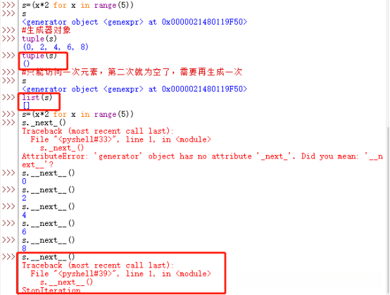 通过花括号构造元组时,默认会采用小括号表示的构造方式;这种构造方式不会形成列表或元组而是会形成一个迭代实例;即为一个迭代实例;可将其转换为列表或元组;也可将其转换为迭代实例;或者直接作为迭代实例来操作;若需再次访问其中的数据,则需重新初始化该迭代实例: