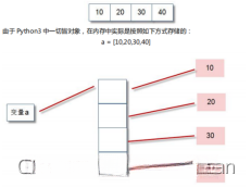 在内存区域中存放多个数值的空间被称为序列,在这种数据结构中所存储的是整数对象的引用位置而非具体数值值。常见的序列类型包括字符串、列表、元组、字典和集合等。例如一个整数序列[10 20 30 40]可以表示为: