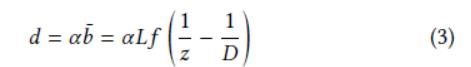 The equation presents two significant outcomes. First, disparity is influenced by the focus distance z, amounting to zero when the depth D equals the focus distance (D = z). Second, a linear relationship exists between the inverse of depth and disparity, with its parameters remaining constant across space.