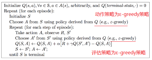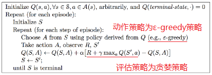 Q-learning算法是基于贪婪策略,选择使得Q(S',a)最大的动作a来更新Q(S,A);此时不执行动作a,当Q更新后,新的执行动作基于状态S',然后用\epsilon-greedy策略重新得到。