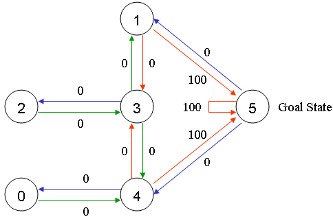 注意:编号为5的房间有一个指向自己的箭头,其reward值为100,其他指向目标房间的边的reward值也为100。Q-learning的目标是达到reward值最大的状态,因此,当智能体到达目标房间后将永远停留在那里,这种目标也称为“吸收目标”(absorbing goal)。
