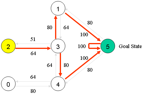 一旦矩阵Q足够接近于收敛状态,智能体便学习到了转移至目标状态的最佳路径。如图所示: