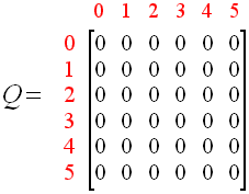 类似地,可以构建一个矩阵Q,用来表示智能体已经从经验中学到的知识,矩阵Q与R是同阶的,其行表示状态,列表示行为。由于刚开始时,智能体对外界环境一无所知,因此矩阵Q被初始化为零矩阵。为简单起见,在本例中,我们假设状态的数目是已知的(即6)。对于状态数目未知的情形,可以让Q从一个元素出发,每次发现一个新的状态时就可以在Q中增加相应的行列。