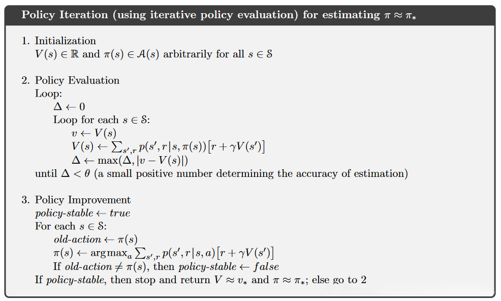 基本思想:从一个初始策略开始,不断地改进这个策略达到最优解。每次迭代时首先用策略评估计算一个策略的状态价值函数,然后根据策略改进方案调整改策略,再计算新策略的状态价值函数,如此反复直到收敛。