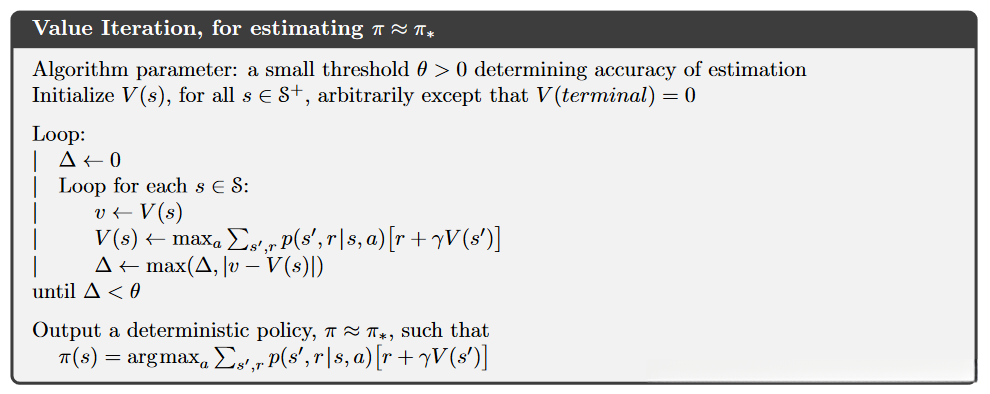值迭代算法与策略迭代算法的区别:不是对某一策略的状态价值函数进行计算,而是直接收敛到最优的状态价值函数 。