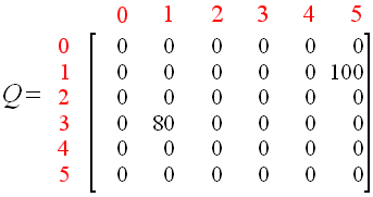 \begin{array}{c} Q(3,1) &=& R(3,1) + 0.8*max[Q(1,3),Q(1,5)]\\ &=& 0 + 0.8*\max [0,100]\\ &=& 80 \end{array}